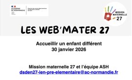 Cette Web’Mater, proposée par la Mission maternelle 27 en collaboration avec l’équipe ASH, s’adresse aux enseignants de maternelle et aux équipes éducatives confrontés à l’accueil d’élèves à besoins éducatifs particuliers.